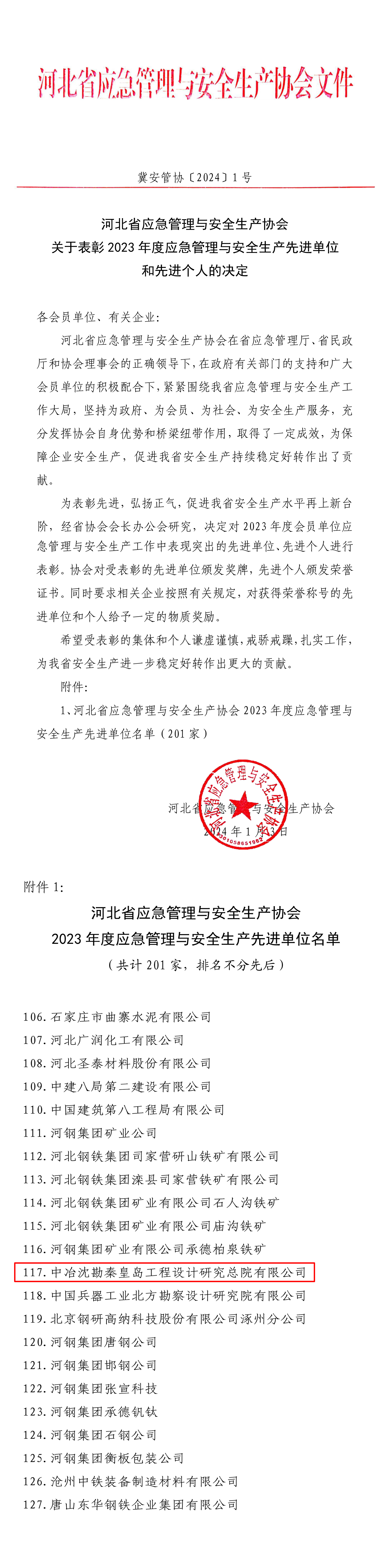 1月3日,河北省應急管理與安全生產(chǎn)協(xié)會印發(fā)表彰決定,中冶沈勘秦皇島公司榮獲河北省應急管理與安全生產(chǎn)協(xié)會“2023年度應急管理與安全生產(chǎn)先進單位”。